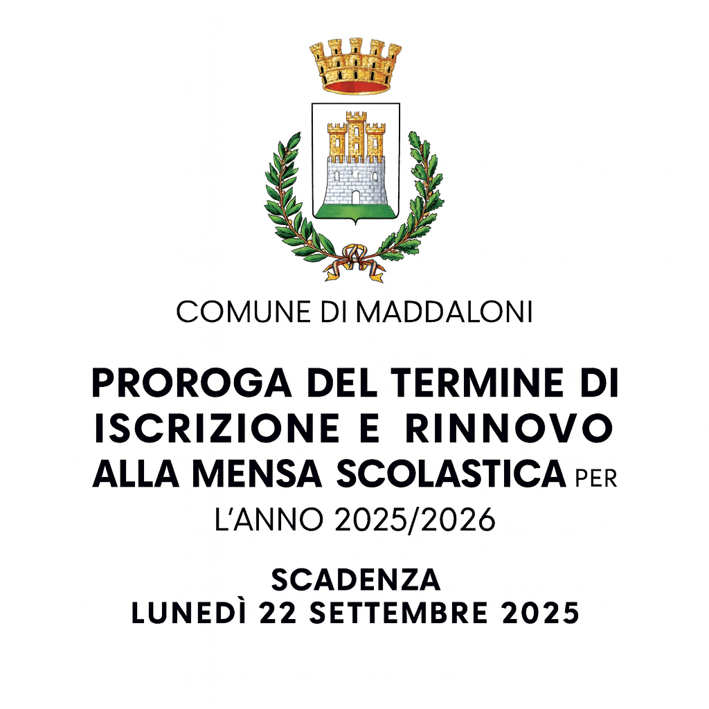 Descrizione PROROGA DEL TERMINE DI ISCRIZIONE E RINNOVO ALLA MENSA SCOLASTICA PER L’ANNO 2025/2026.Scadenza LUNEDI’ 22 SETTEMBRE 2025.clicca qui per l'avviso originale