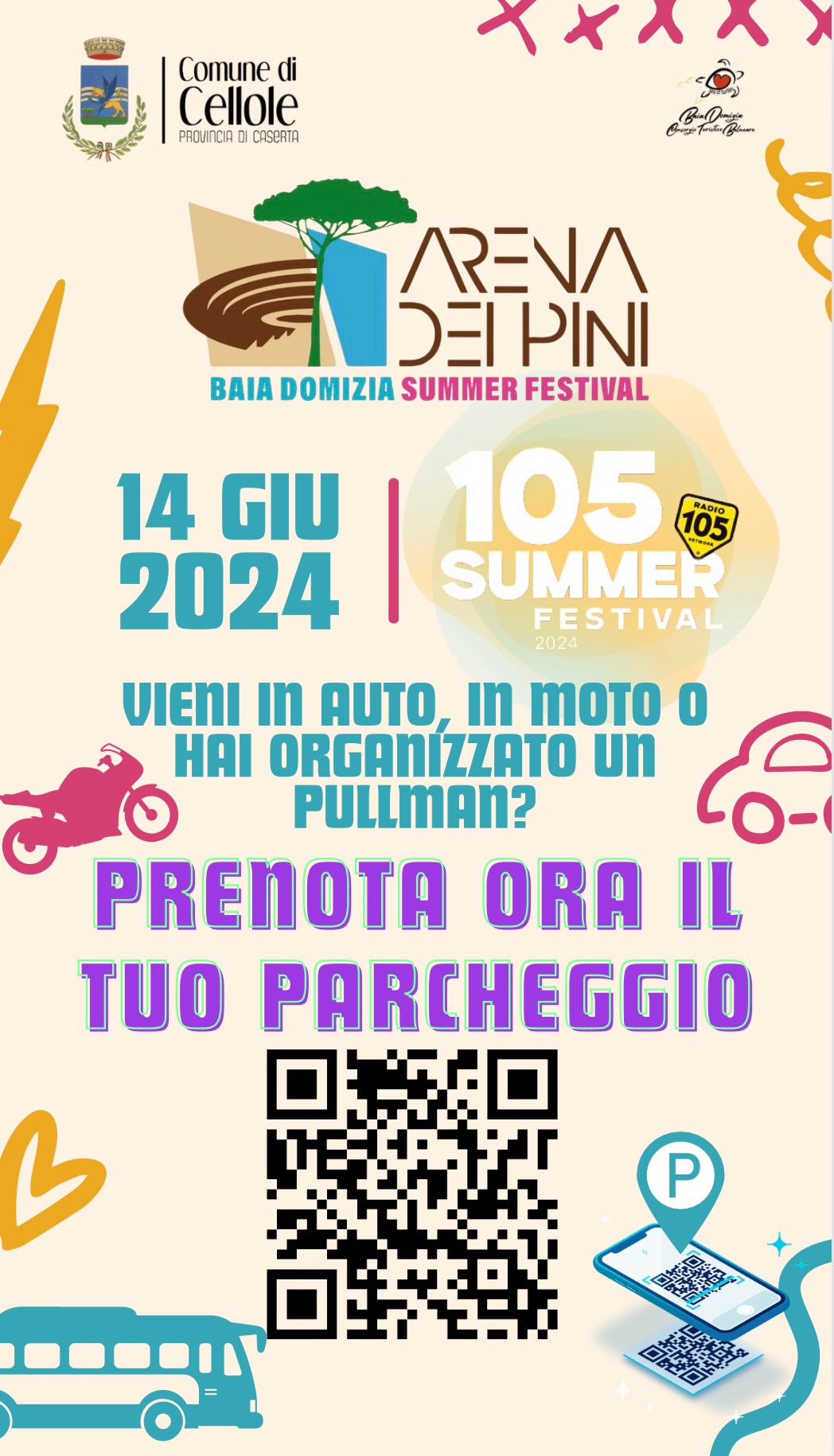 Il Comune di Cellole avvisa che ospiterà presso l’Arena dei Pini, sita in Baia Domizia Sud – via Fontanavecchia, il “Radio 105 Summer Festival” e siccome è previsto l’arrivo di circa 30.000 spettatori, si chiede di pubblicare sui propri siti web e Albo Pretorio, la presente comunicazione e l’allegato avviso per l’acquisto dei pass parcheggi al fine di agevolare l’accesso dei veicoli all’area concerto, mostrando il relativo QR CODE, in modo da garantire la sicurezza della circolazione stradale ed il formarsi di code di traffico sulla SS. Domitiana quater.