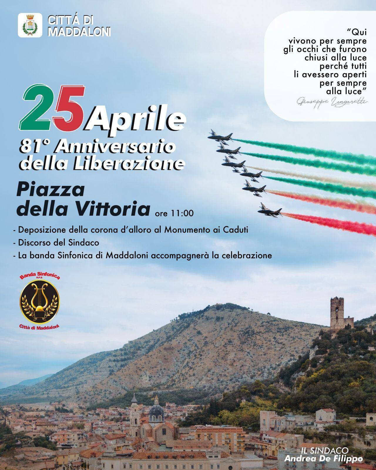 In occasione del 25 Aprile, 81° Anniversario della Liberazione, l’Amministrazione Comunale invita la cittadinanza a partecipare alla cerimonia commemorativa che si svolgerà in Piazza della Vittoria, alle ore 11:00.